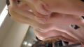 屈み作業を始め、ゆるふわ巻き髪が見え、M字に開く健康的なエロさを感じる小麦肌ピチ肌腿の合間にコーラル色のパンティラインがアップで映ります。